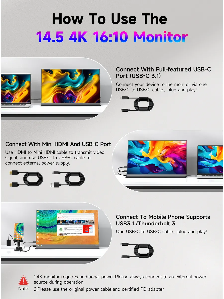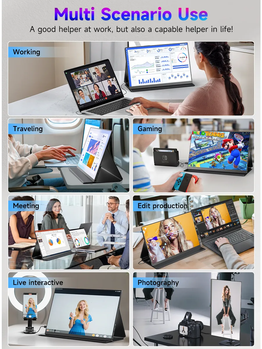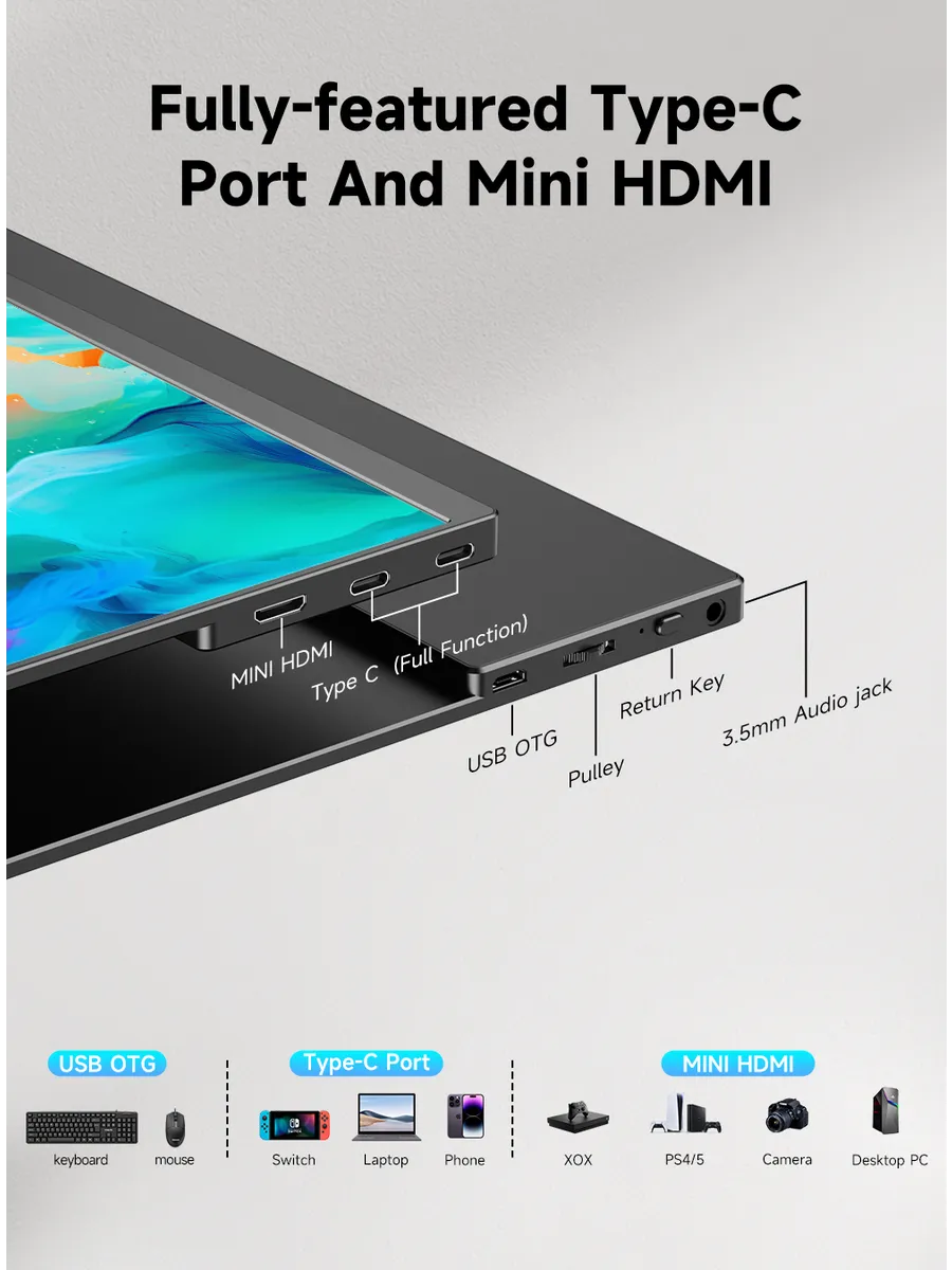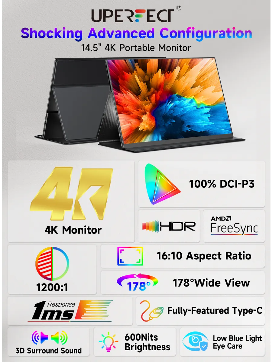 Uperfect J14 - это 14.5-дюймовый портативный монитор, который станет идеальным дополнением к вашему ноутбуку, смартфону или игровой консоли. Модель J14 с разрешением 3840x2400 и IPS-матрицей обеспечивает кристально чистое изображение с широкими углами обзора (178 градусов), что делает его удобным для совместной работы или просмотра контента с друзьями. Монитор оснащен встроенными динамиками и выходом на наушники, а также портами USB Type-C, mini-HDMI и mini-Jack, что позволяет легко подключить его к различным устройствам. Благодаря матовой поверхности экрана и высокой яркости (600 кд/кв.м) изображение остается четким и видимым даже при ярком освещении.