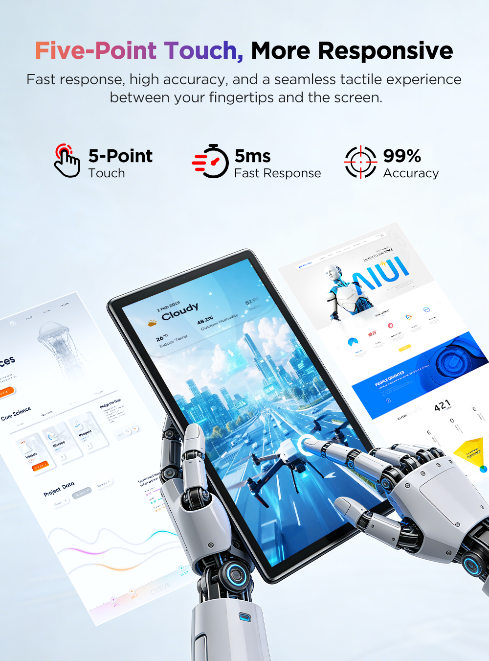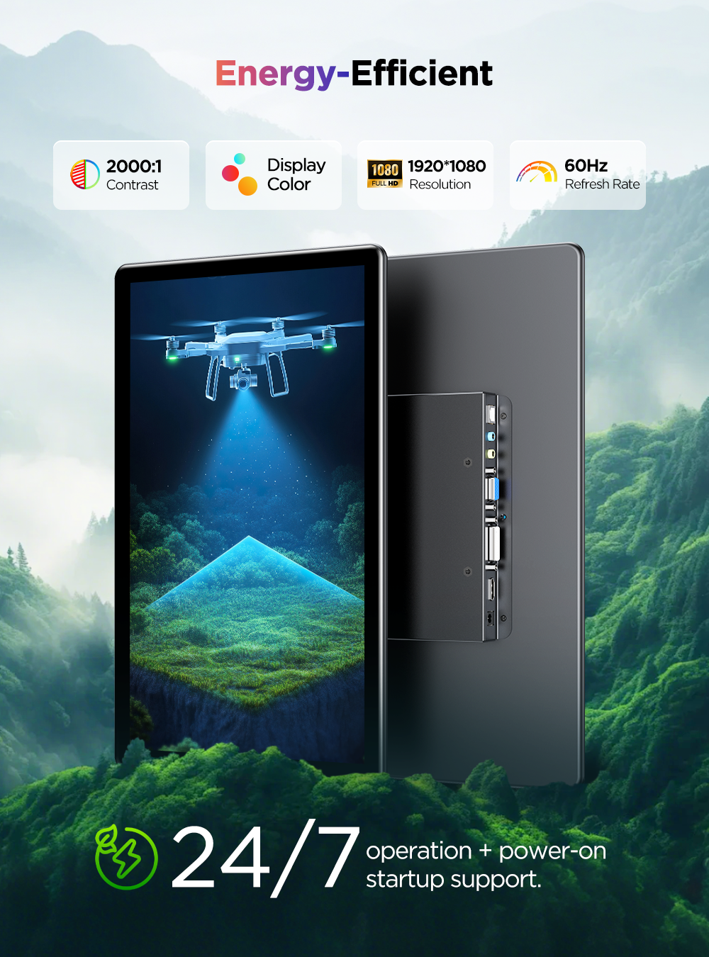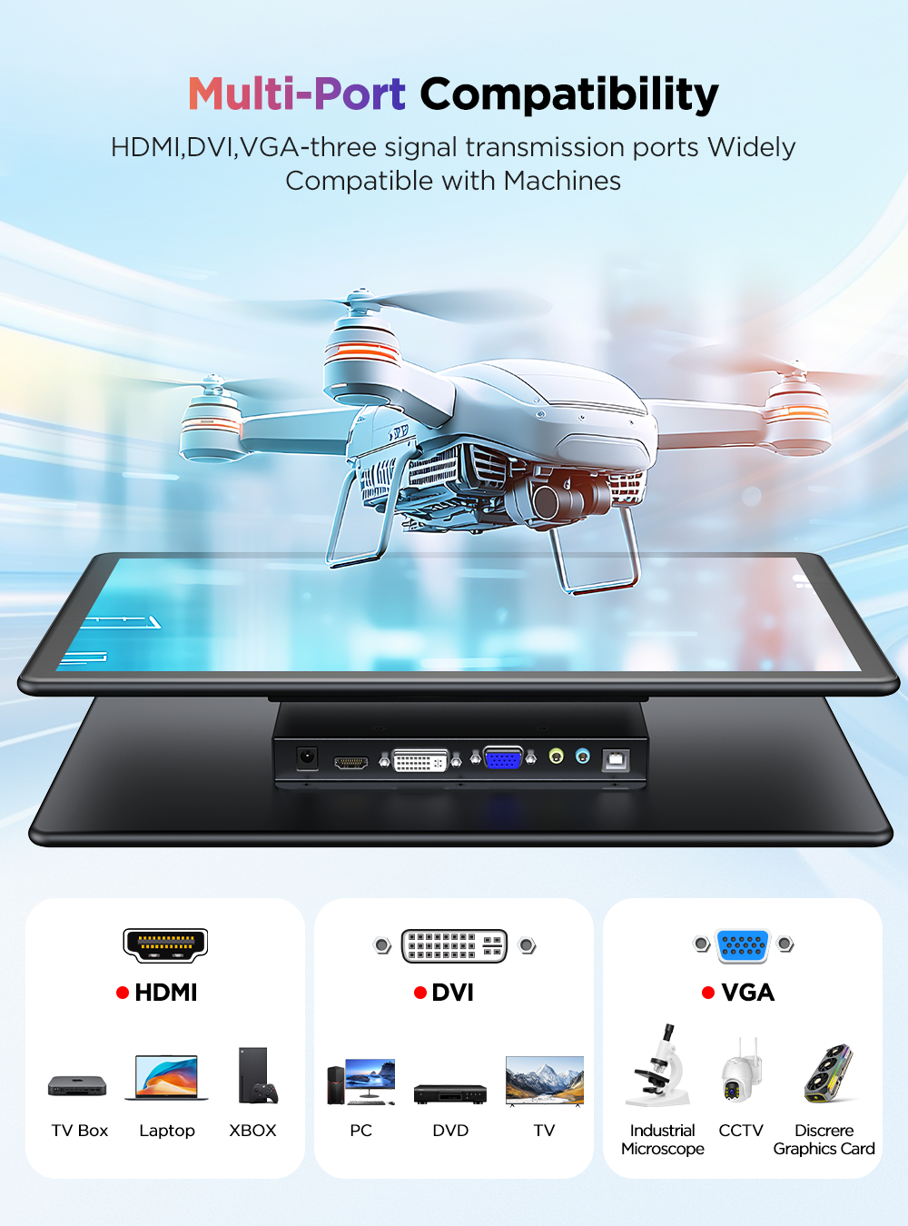 UPi B9 - это 15.6-дюймовый портативный сенсорный монитор, который станет идеальным дополнением к вашему рабочему месту или домашнему развлекательному центру. Модель UPi B9 оснащена IPS-матрицей с разрешением Full HD (1920x1080) и широкими углами обзора (178 градусов), что обеспечивает четкое и яркое изображение под любым углом. Этот монитор поддерживает подключение по HDMI, DVI-D и VGA, что позволяет легко подключить его к различным устройствам, таким как ноутбуки, компьютеры и игровые консоли. Благодаря компактным размерам и Included VESA-совместимому креплению, UPi B9 легко транспортировать и устанавливать в любом удобном месте.