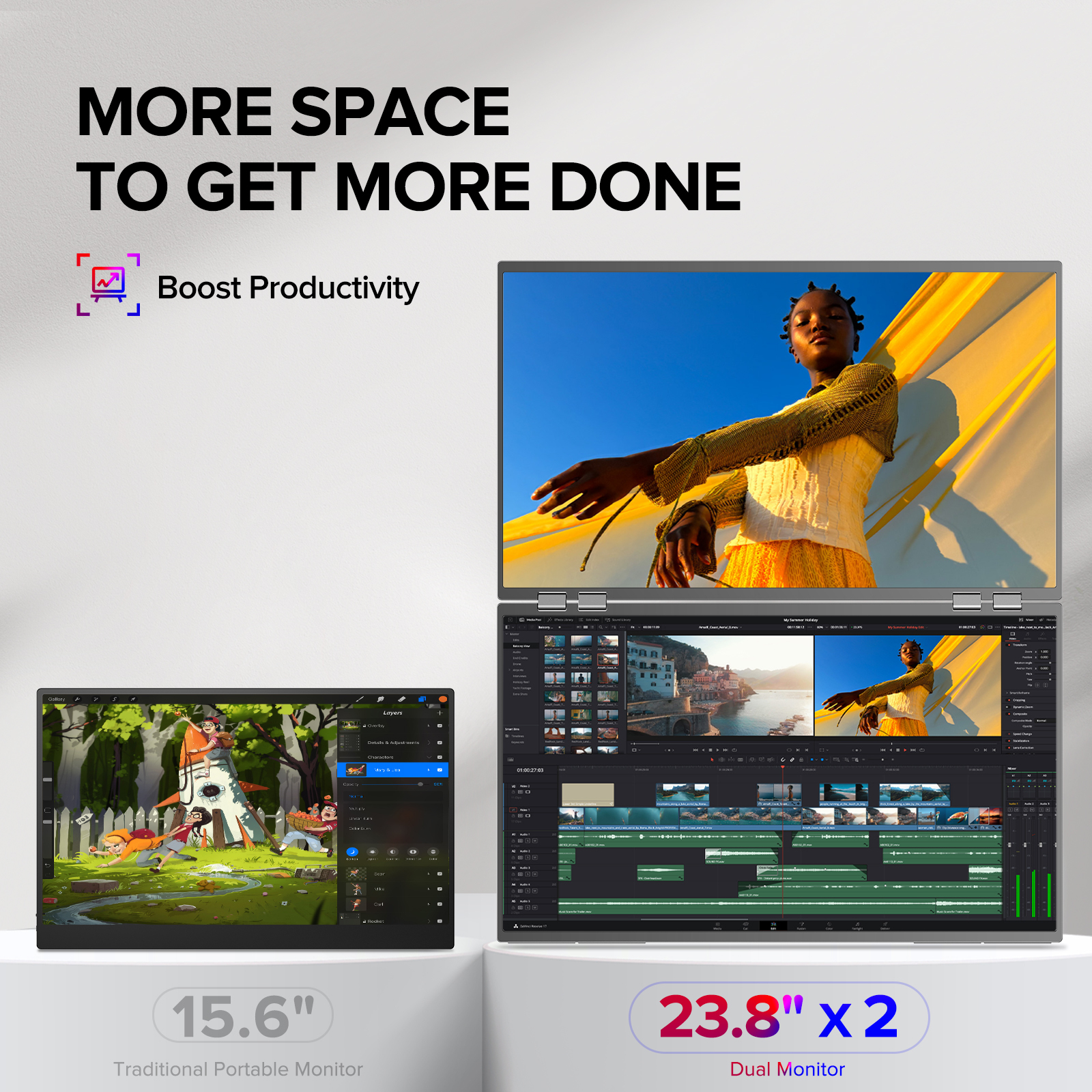 Самый большой двойной портативный монитор от компании Uperfect. Два рабочих пространства по 23.8 дюйма, с FHD (1920х1080) разрешением и частотой обновления 100Hz. Имеет удобную подставку.