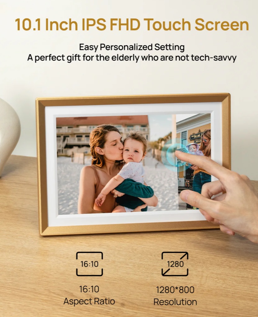 Цифровая сенсорная фоторамка от самого крупного производителя портативных мониторов - Arzopa. Имеет матрицу IPS, встроенную систему Frameo App с поддержкой русского языка, внутреннюю память 32Gb, а также подставку, позволяющую удобно расположить устройство на столе или полке. Загрузка фотографий на фоторамку (если она подключена к Wi-Fi возможна из любой точки планеты где ловит интернет на ваших телефонах). Прекрасный подарок родным и близким, позволяющий не забывать о ваших счастливых жизненных моментах.